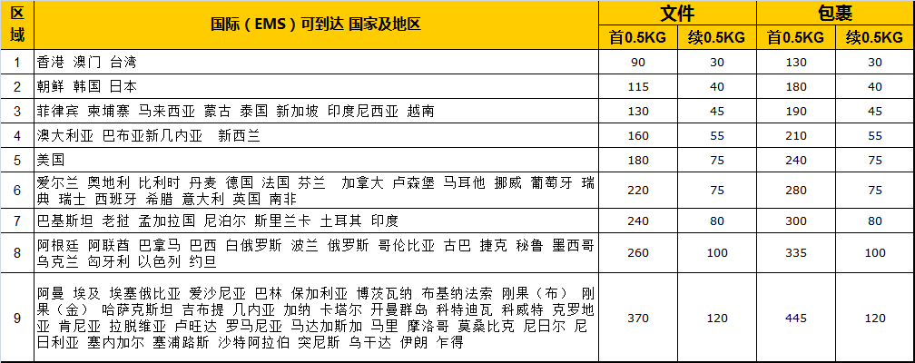 提示:具體通達國家及重量,尺寸標準來電咨詢!EMS報價變動性較大,交貨時請來電咨詢! 所有EMS出口件只包出口,不包目的地海關(guān)清關(guān)與簽收結(jié)果!