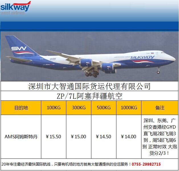 HKG-ZP阿塞拜疆航空到阿姆斯特丹最新優(yōu)惠價(jià),深圳大智通第一時(shí)間了解國際空運(yùn)價(jià)格行情,讓您不必虧在運(yùn)費(fèi)上。訂艙熱線:400-0755-028