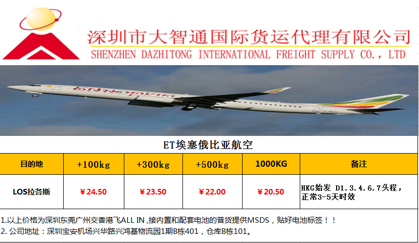拉各斯空運專線是我們深圳大智通國際貨運公司新推出的國際空運航線之一,由于是空運專線服務,所以就有優(yōu)勢,拉各斯空運價格方面也就非常實惠,噸價可以低到20.5元每公斤以下,每天都有航班直飛,走ET(埃塞俄比亞航空公司)歡迎廣大新老顧客朋友咨詢本公司關于拉各斯空運專線的詳情