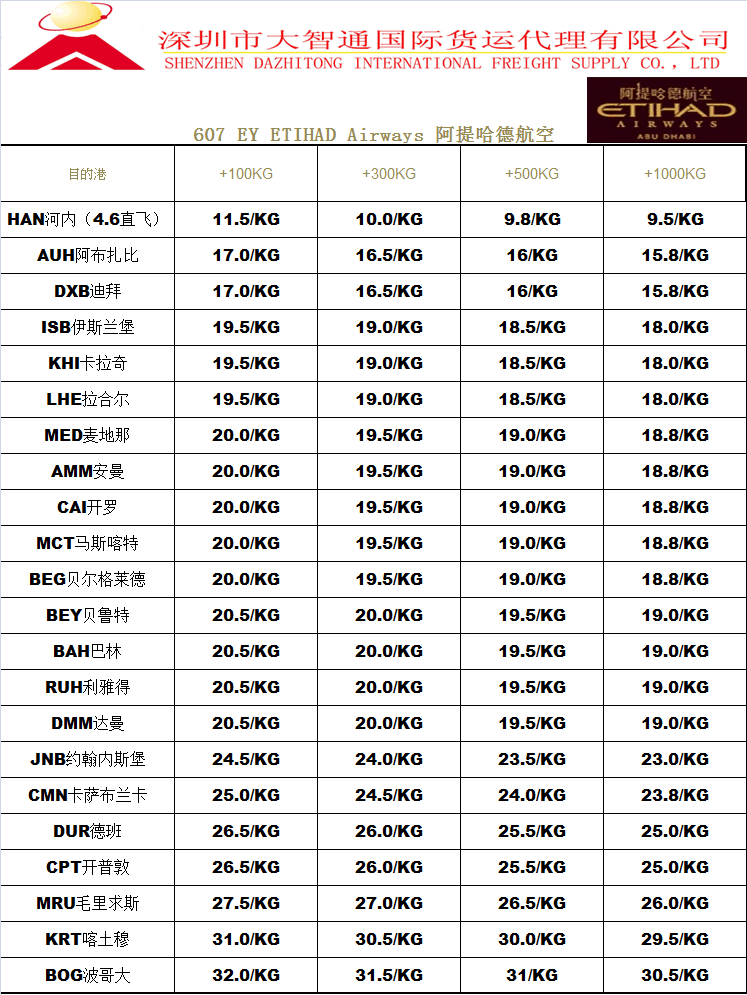 EY阿提哈德航空專線,國(guó)際空運(yùn)價(jià)格查詢表