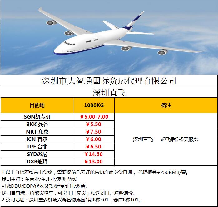 深圳直飛,胡志明 曼谷最新空運(yùn)價(jià)格,清關(guān)快捷安全方便,為你提供一站式的服務(wù)保障!價(jià)格低,時(shí)效快。深圳大智通國際空運(yùn),20年老牌,值得