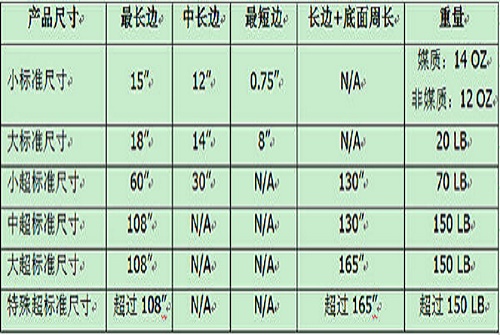 大標(biāo)準(zhǔn)尺寸為:最長邊<=18'',中長邊<=14'',最短邊<=8'',重量<=20 lb