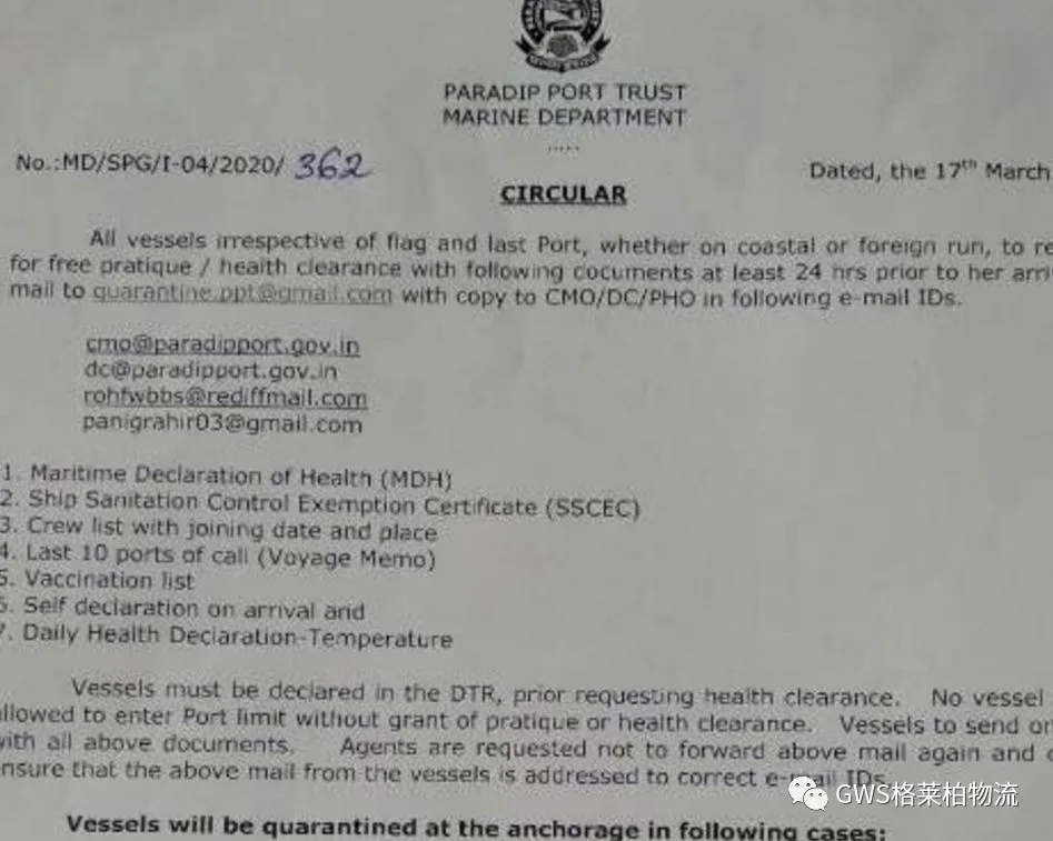 與此同時,印度航運總局(DGS)針對疫情防控,開始對中國及相關(guān)疫情嚴(yán)重國家所有港口出發(fā)的船舶實行14天隔離檢疫,14天的隔離時間是從上一個港口離港開始算起。