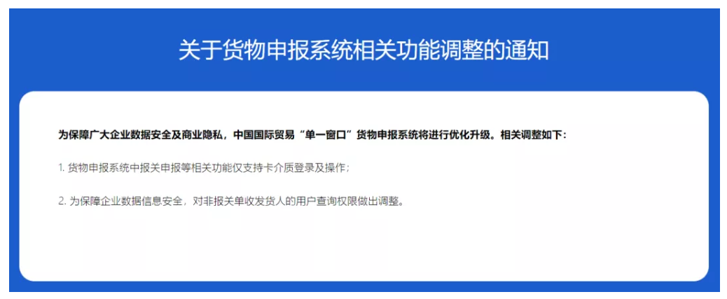 9月21日,單一窗口發(fā)布關(guān)于貨物申報(bào)系統(tǒng)相關(guān)功能調(diào)整的通知,為保障企業(yè)數(shù)據(jù)安全及商業(yè)隱私,貨物申報(bào)系統(tǒng)中報(bào)關(guān)申報(bào)等相關(guān)功能僅支持卡介質(zhì)登錄及操作,對(duì)非報(bào)關(guān)單收發(fā)貨人的用戶查詢權(quán)限做出調(diào)整。