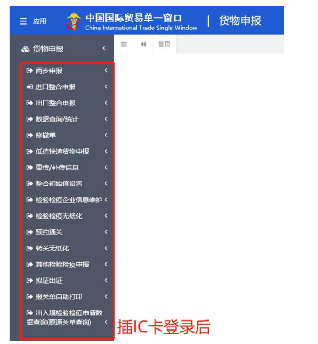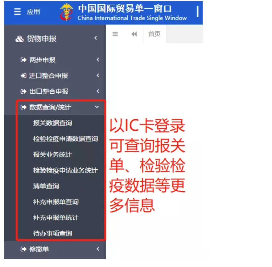 貨主插IC卡登錄單一窗口,在貨物申報(bào)欄目左側(cè)的“數(shù)據(jù)查詢/統(tǒng)計(jì)”功能,如下圖: