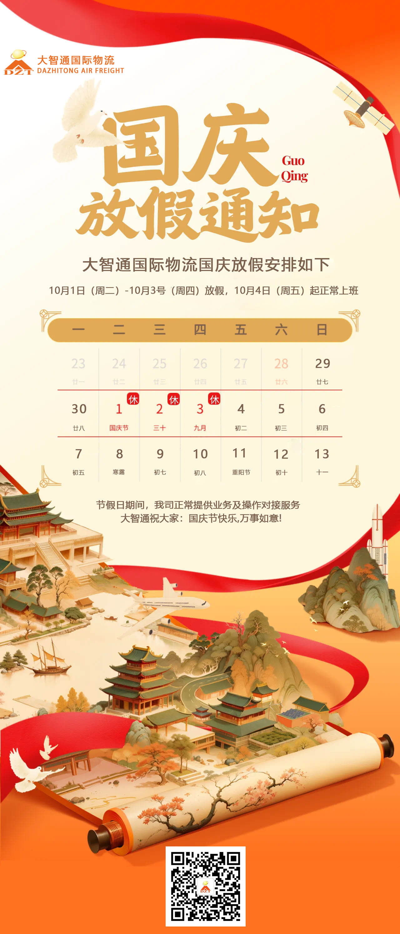 您好,正值國(guó)慶佳節(jié)歡度之際,深圳市大智通國(guó)際貨運(yùn)代理有限公司全體員工在此感謝長(zhǎng)期以來(lái)對(duì)我們的支持與厚愛(ài)!2024年我司“國(guó)慶節(jié)放假通知”如下: