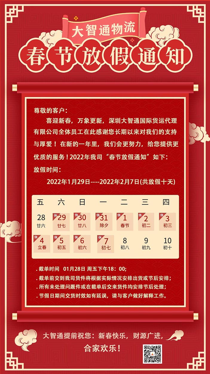 大智通物流2022春節(jié)放假通知來(lái)了,請(qǐng)查收??!